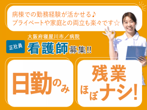 ≪寝屋川市/病棟の看護師/正社員≫☆残業ほぼなし◎賞与3.0ヶ月分◎託児所利用可◎通勤手当5万円まで支給☆病院のお仕事です★(osa)