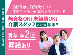 ≪天理市/無資格介護職/正社員≫★職場見学OK◎高収入も目指せる◎夜勤手当あり◎昇給あり★短期入所生活介護施設でのお仕事です☆(kyo)