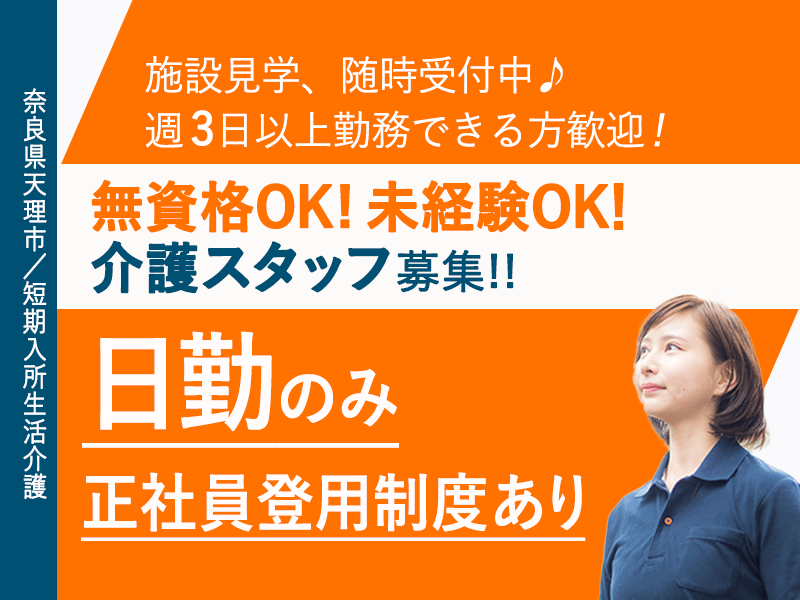 ≪天理市/無資格介護職/パート≫★施設見学随時受付中♪幅広い経験が積める♪夜勤なし♪昇給あり★短期入所生活介護施設でのお仕事です☆(kyo)