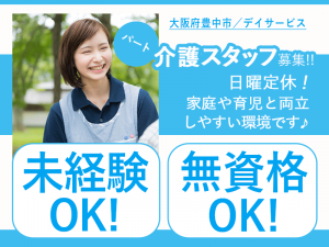 ≪豊中市/無資格介護職/パート≫★◎日曜定休◎昇給・賞与あり◎正社員登用制度あり◎教育プログラムの充実★デイサービスでのお仕事です☆