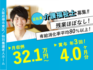 ≪堺市東区/介護福祉士/正社員≫◆月収32.1万円~★賞与年3回!4.0ヶ月分★残業ほぼゼロでプライベート充実★住宅手当など各種手当多数★有給消化率平均80%以上◆特別養護老人ホームでのお仕事です☆(osa)