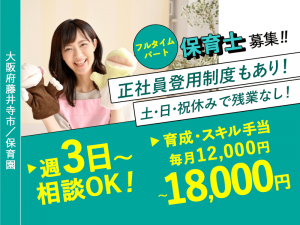 ≪藤井寺市/保育士/フルタイムパート≫◆土日祝休み★残業なしのフルタイムパート★正社員登用制度もあり!ブランク歓迎♪子育て中の職員も多く在籍♪通勤手当上限なし★車通勤もOK◆保育園でのお仕事です☆